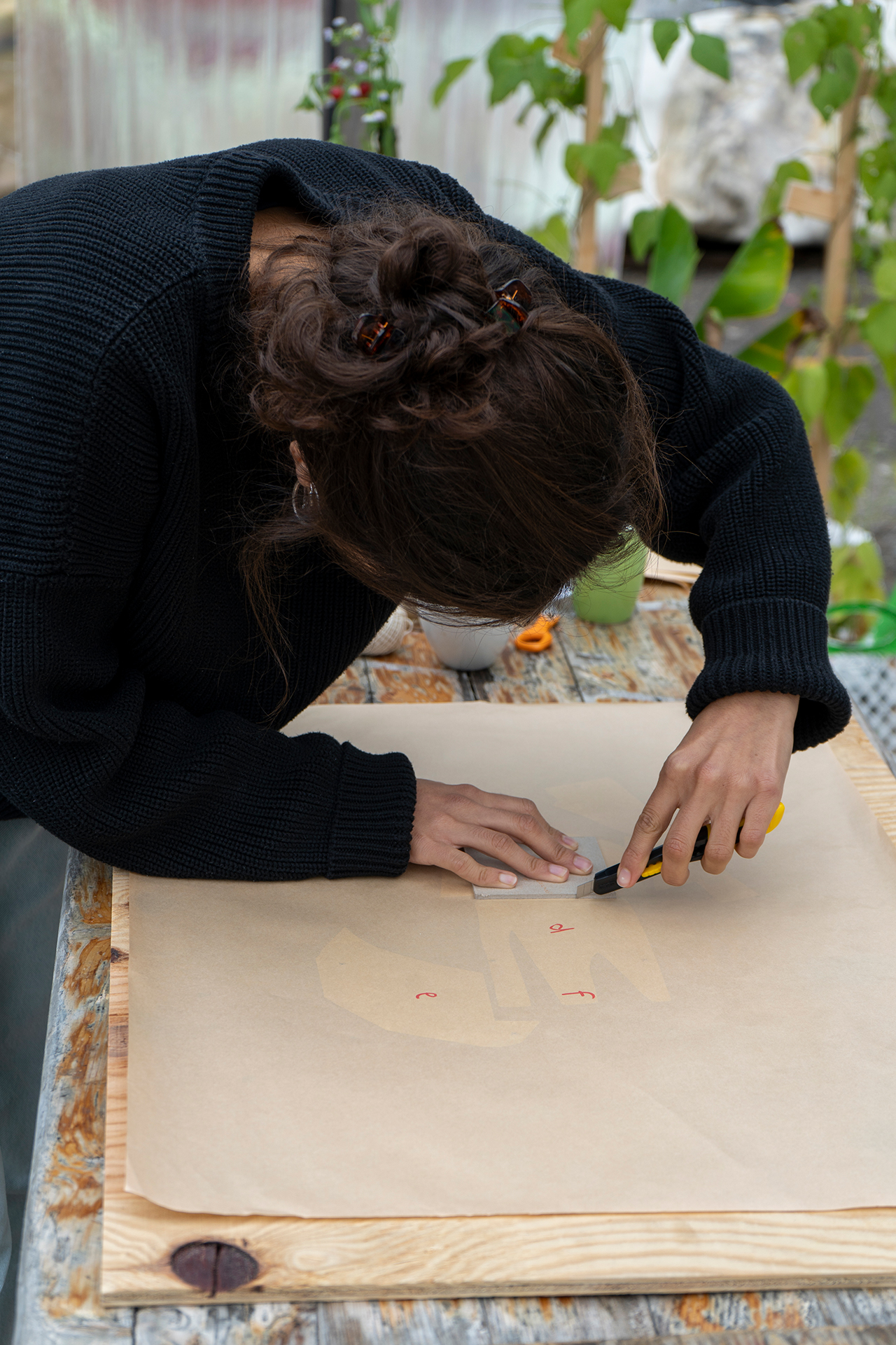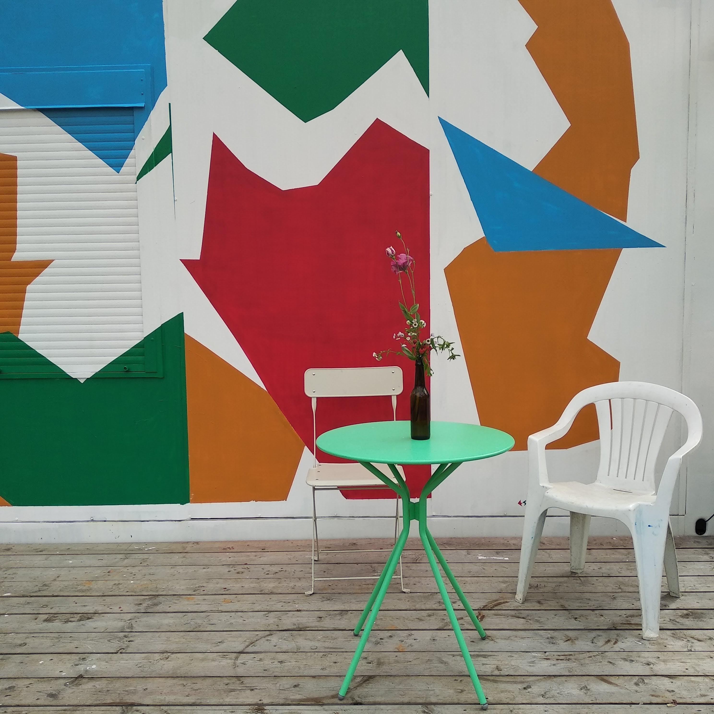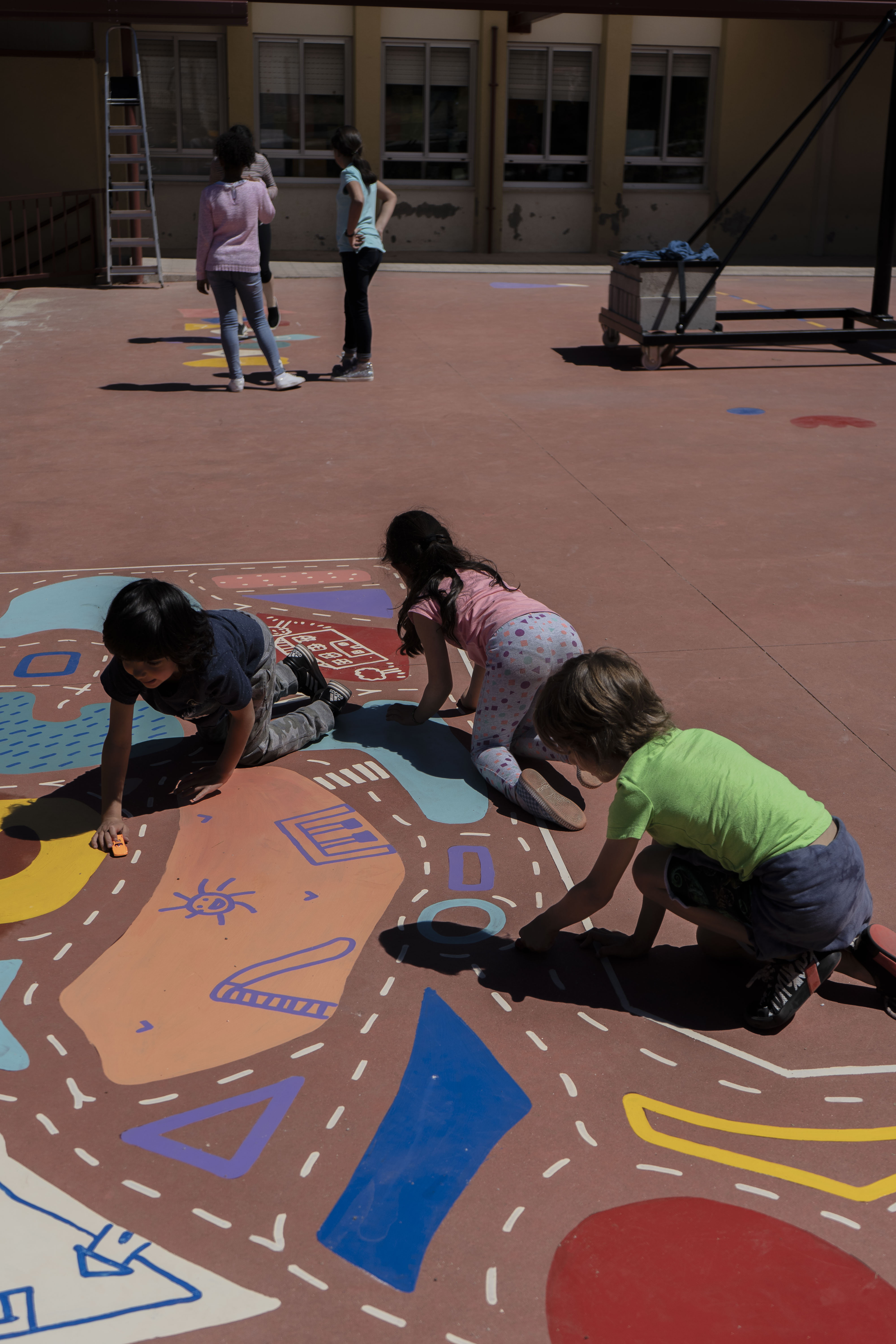 La composición de colores surge tras una charla con vecinos, en un taller con alumnos del IFE del IES Gabriela Mistral, en el que generamos una composición en cadenada de retratos obtenidos a través de un diagrama de araña sobre ellos y sus relaciones con el barrio.