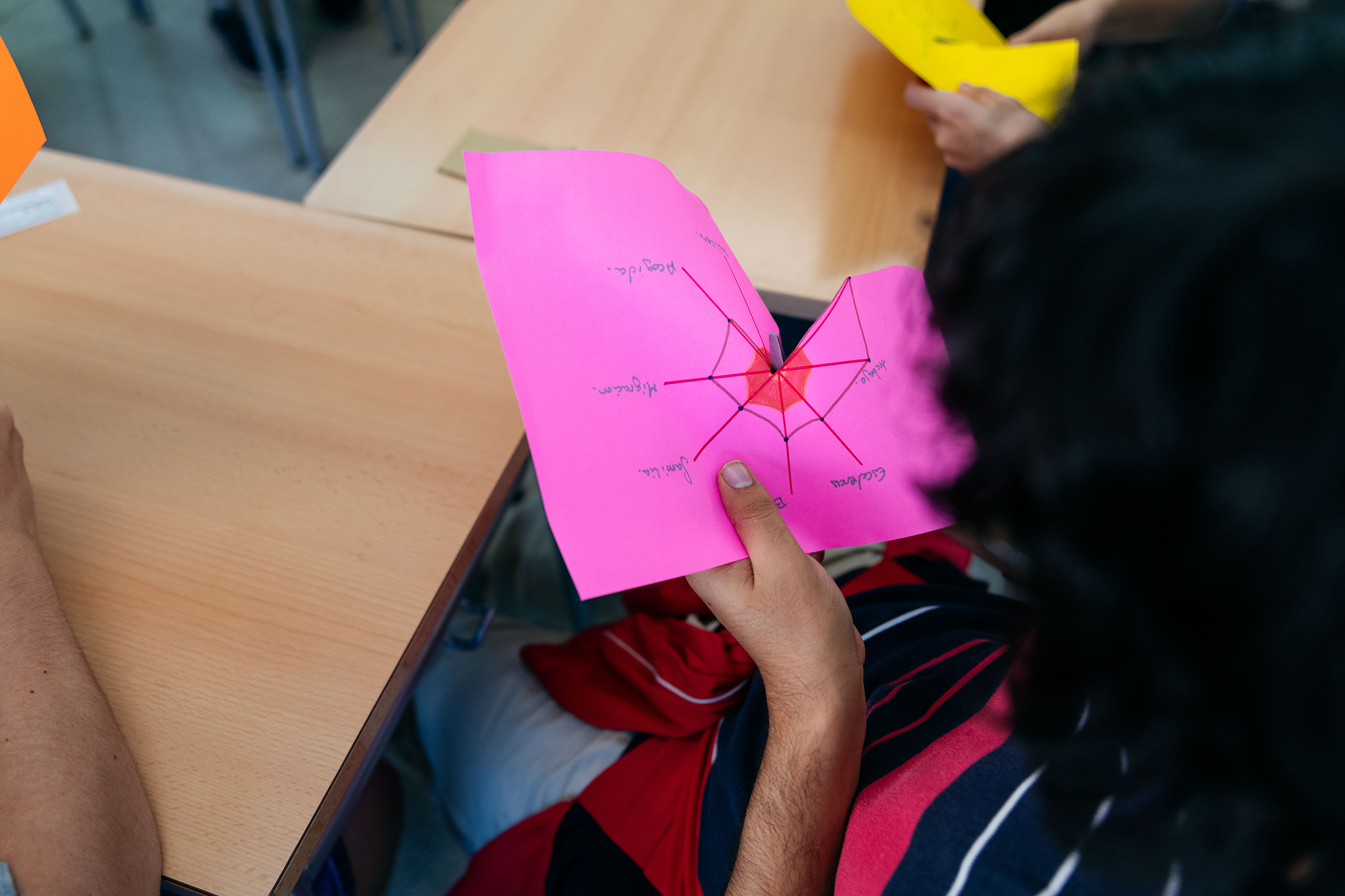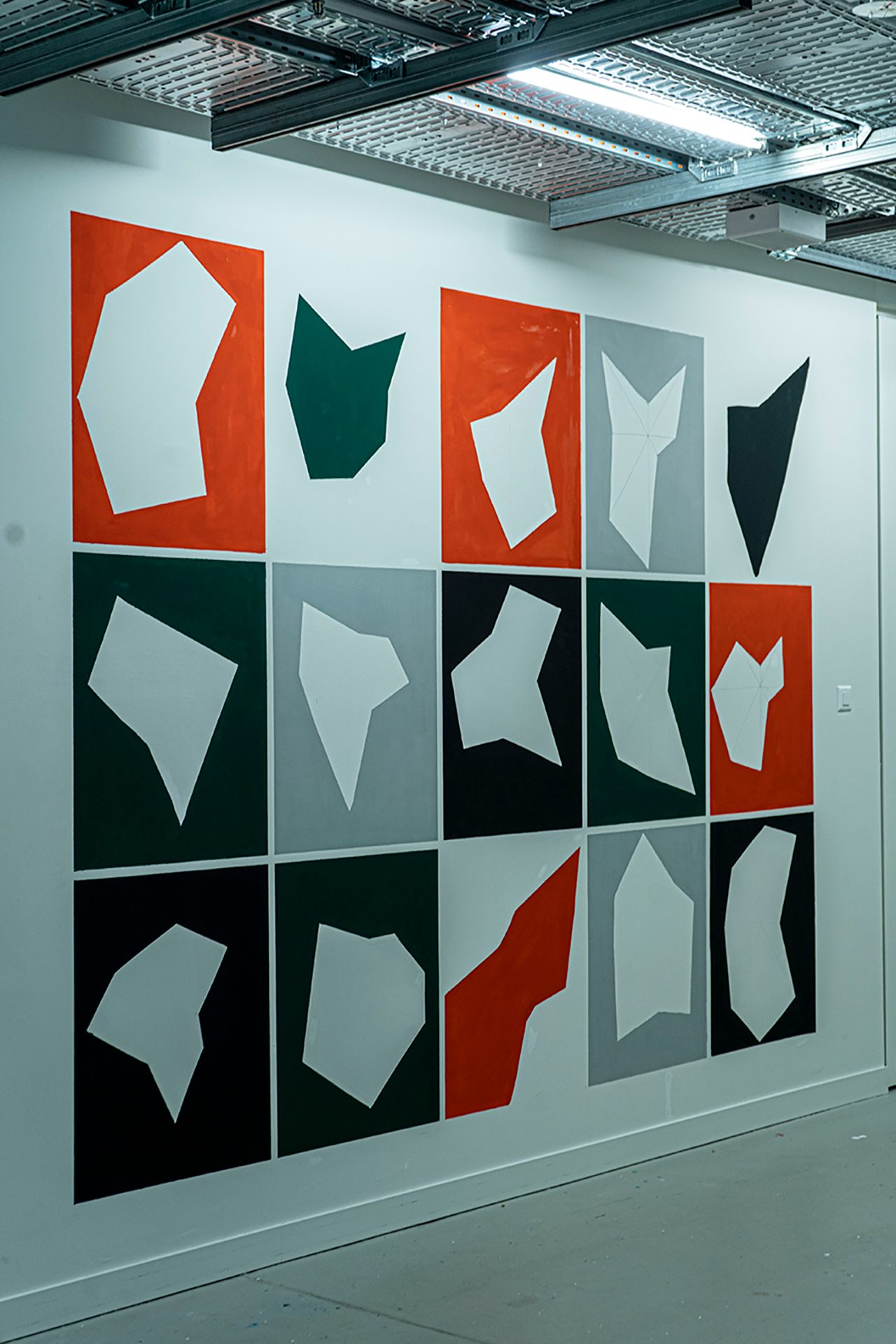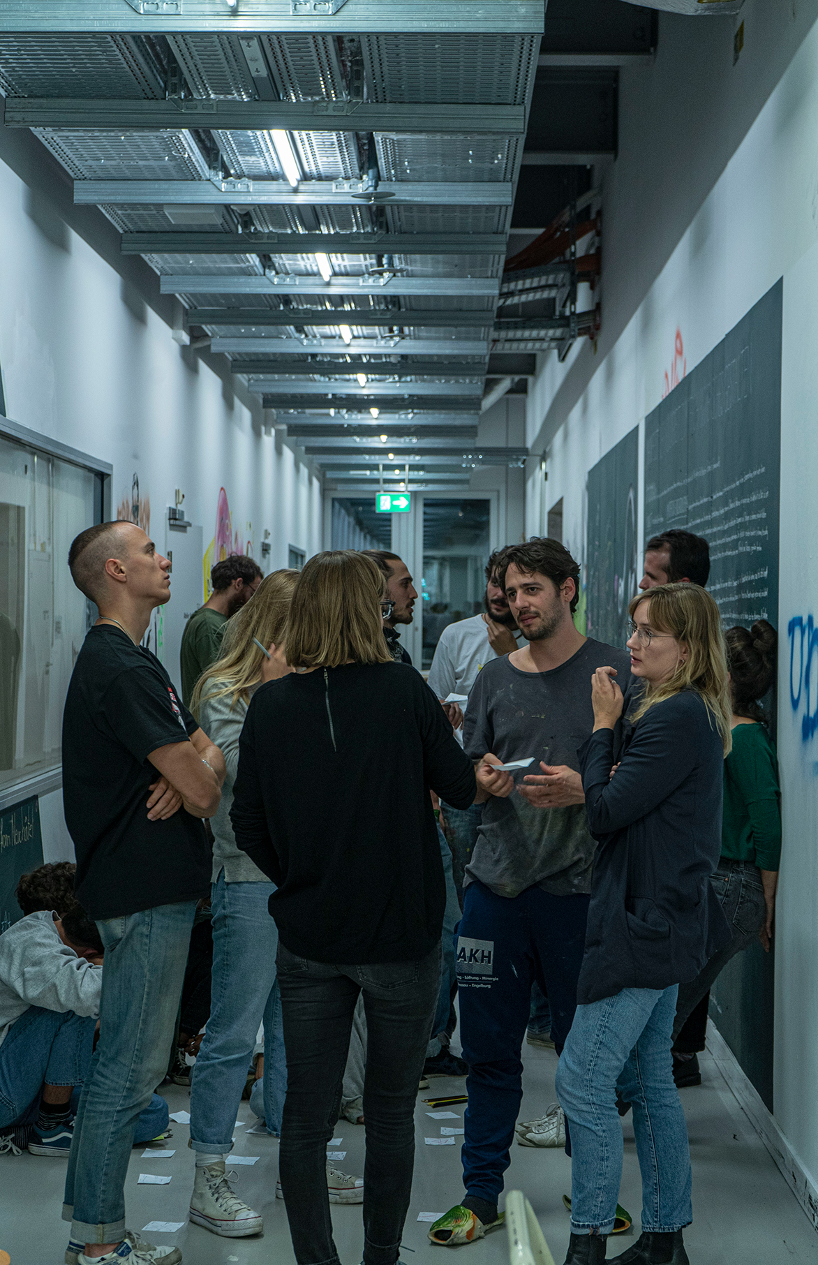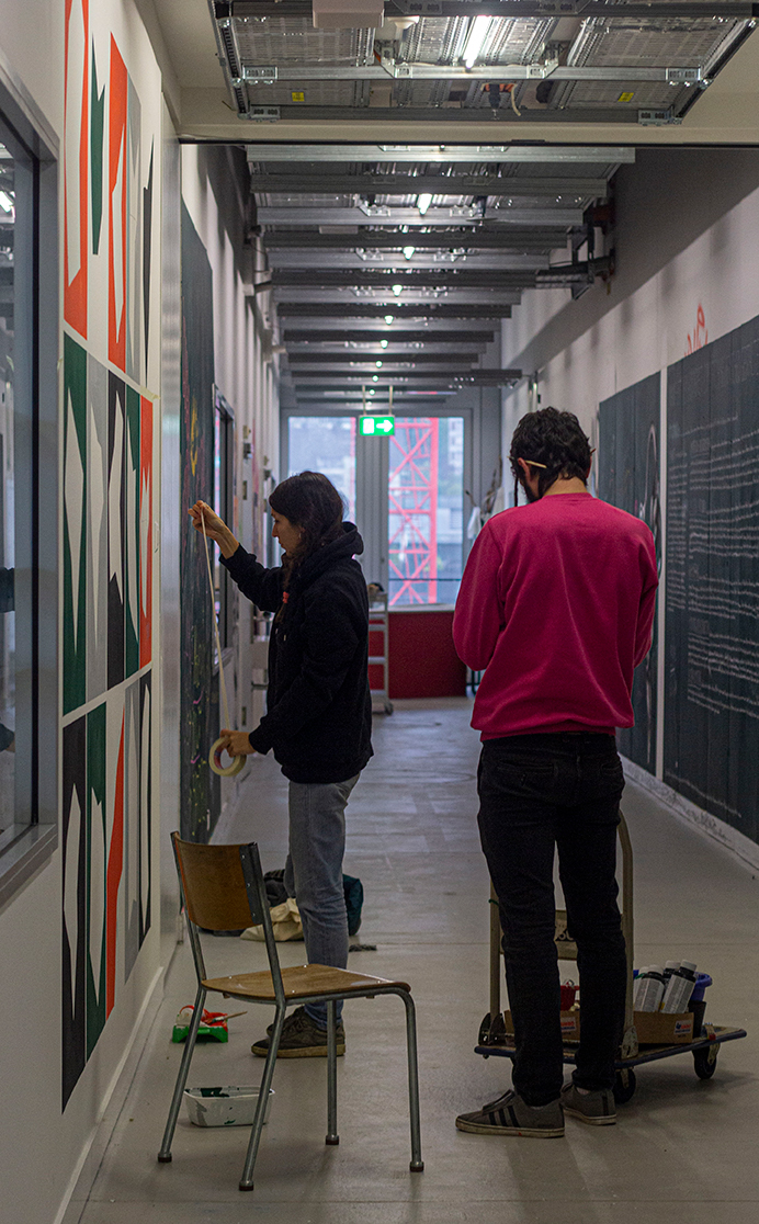 El segundo de los murales que pintamos en Suiza lo hicimos en la Universidad ZHDK, junto a los alumnos del master de Arte y Educación. Para su diseño propusimos una dinámica basada en los “gráficos de araña” para conseguir una colección de formas personales basadas en su visión del desarrollo de proyectos,