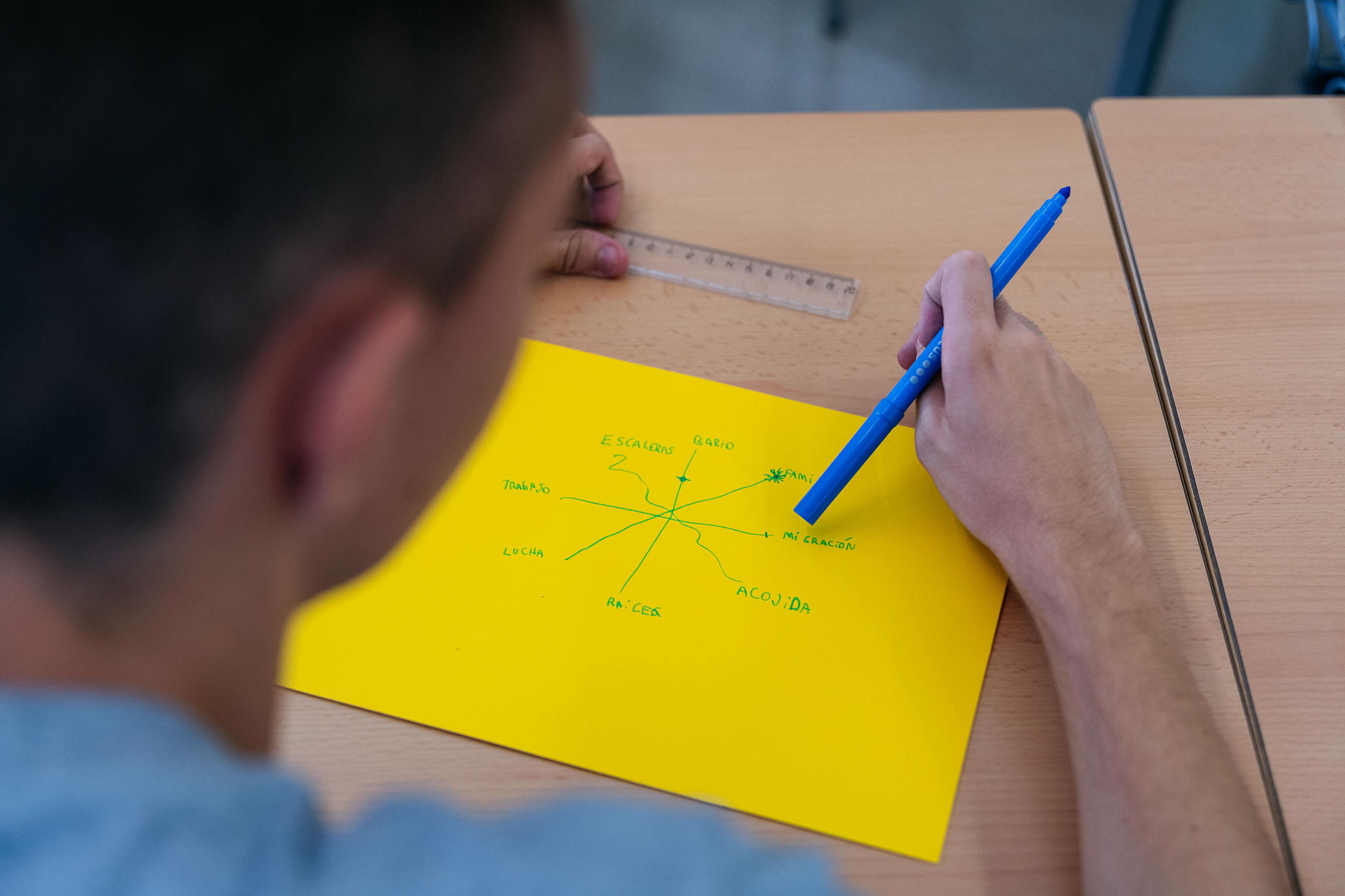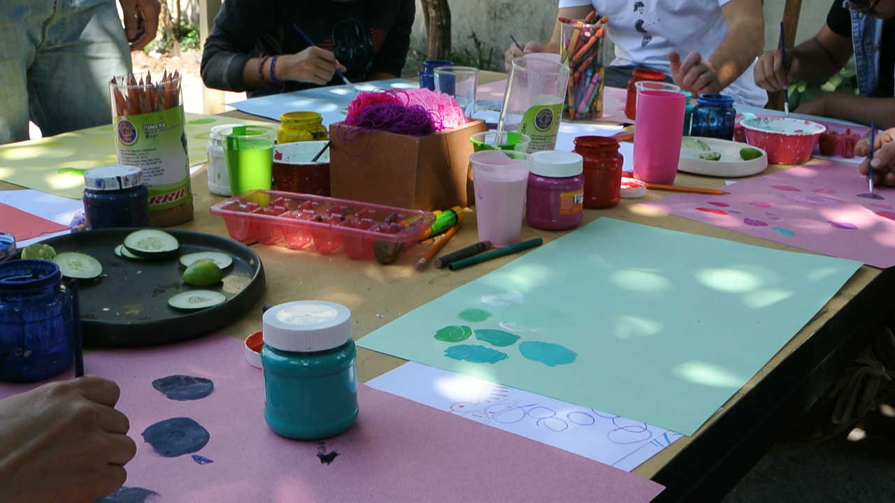 Como en el resto de actividades que realizamos se empezó con un diálogo que nos llevó a un tema, que nos llevó a unas dinámicas plásticas y a un boceto conjunto para terminar siendo un mural.