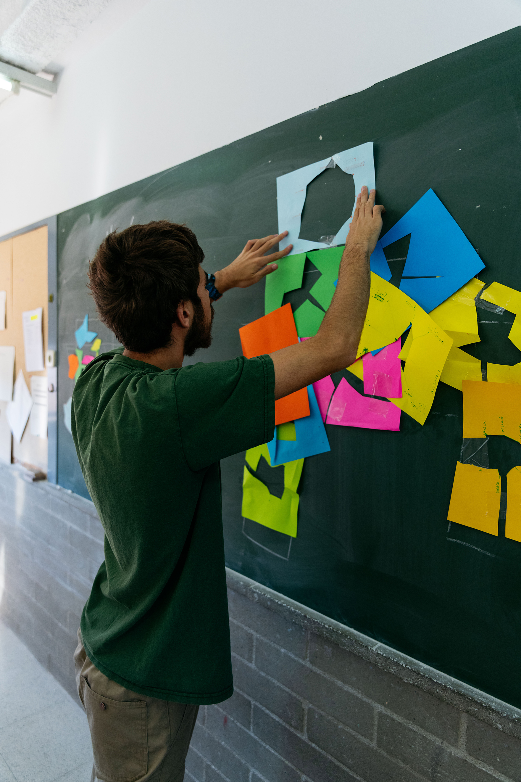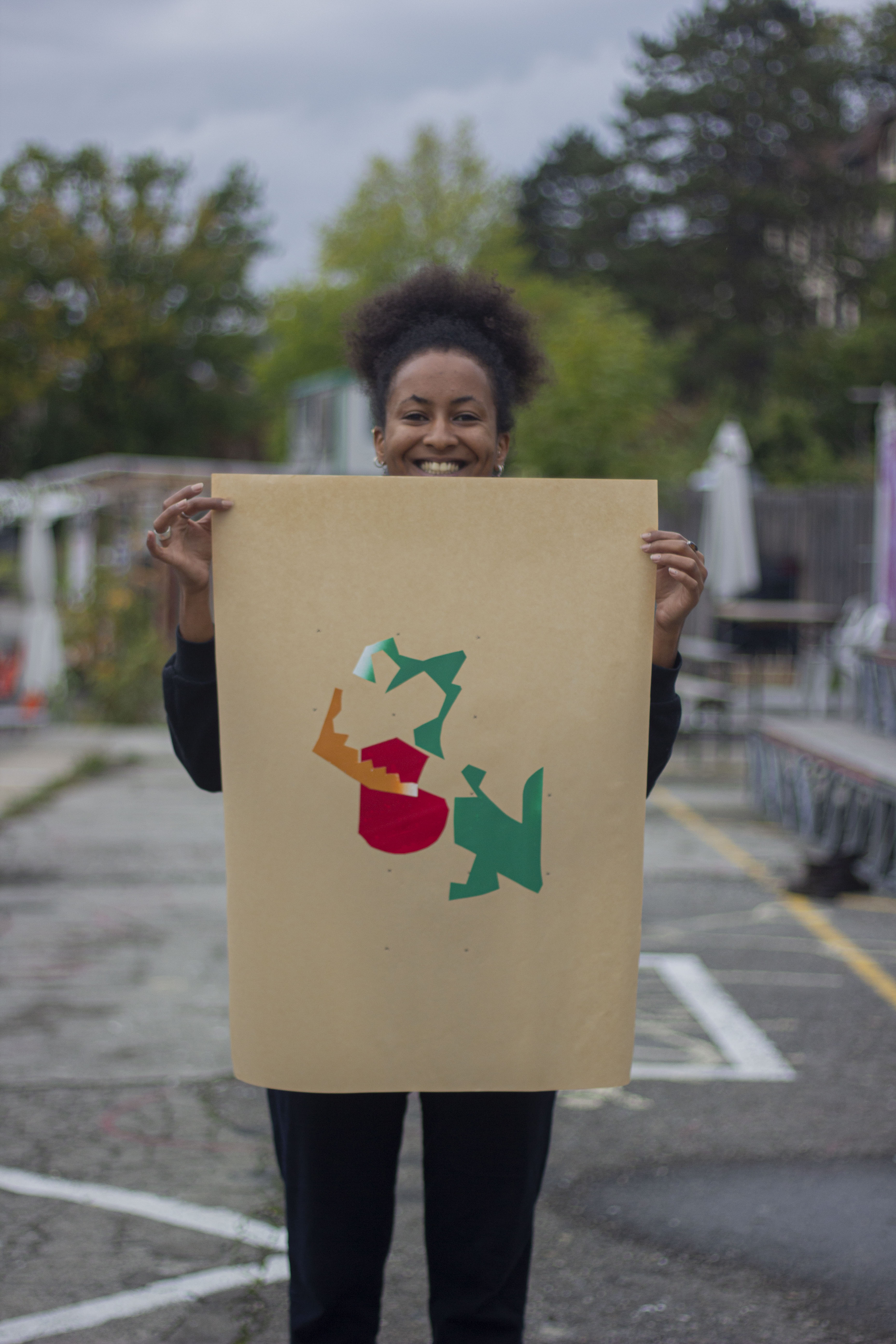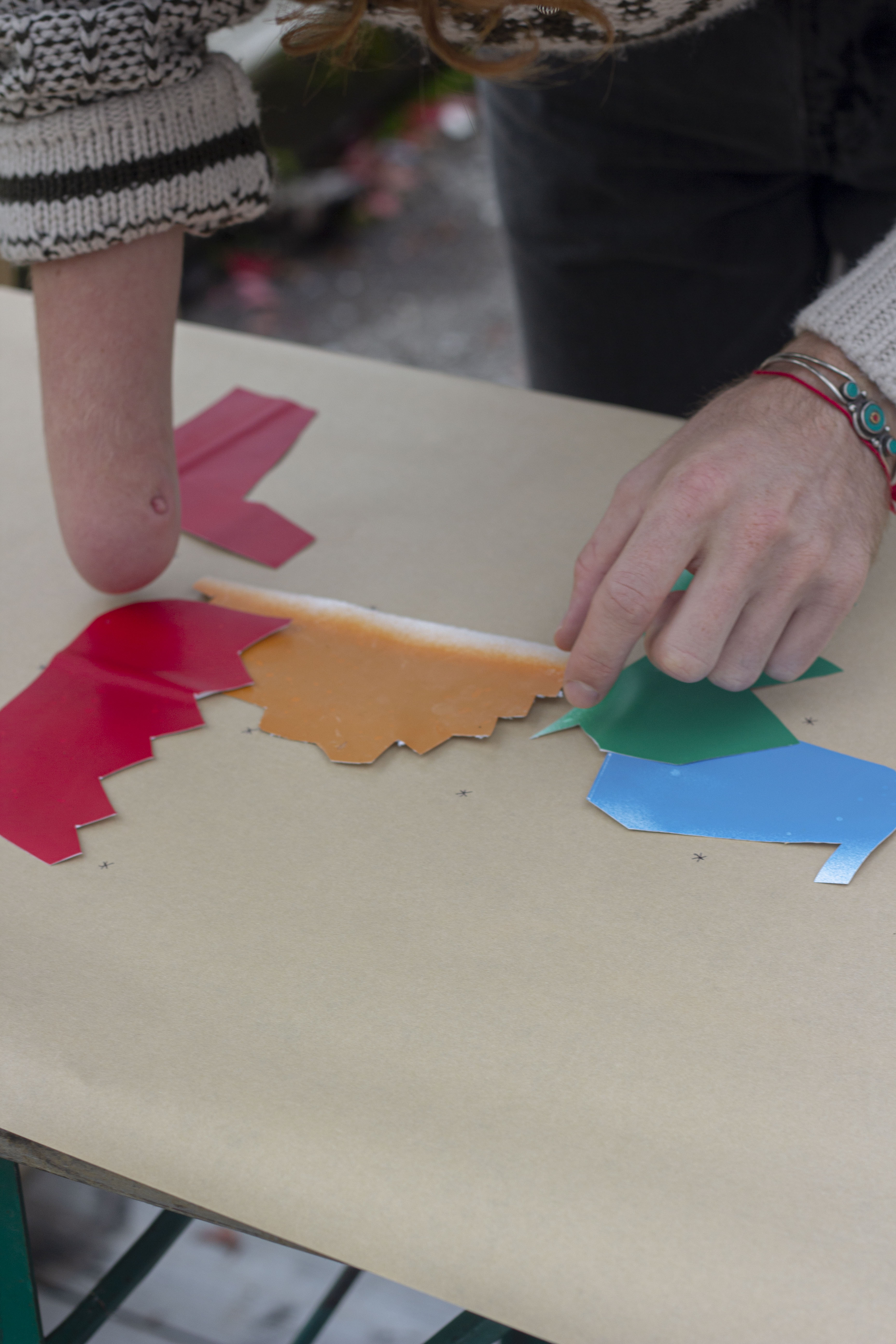 La dinámica se diseña con la ayuda de 5 participantes adultos componiendo con pegatinas de formas orgánicas de colores a partir de la idea del cubo como contenedor de ideas, como herramienta de juego un dado y como soporte.