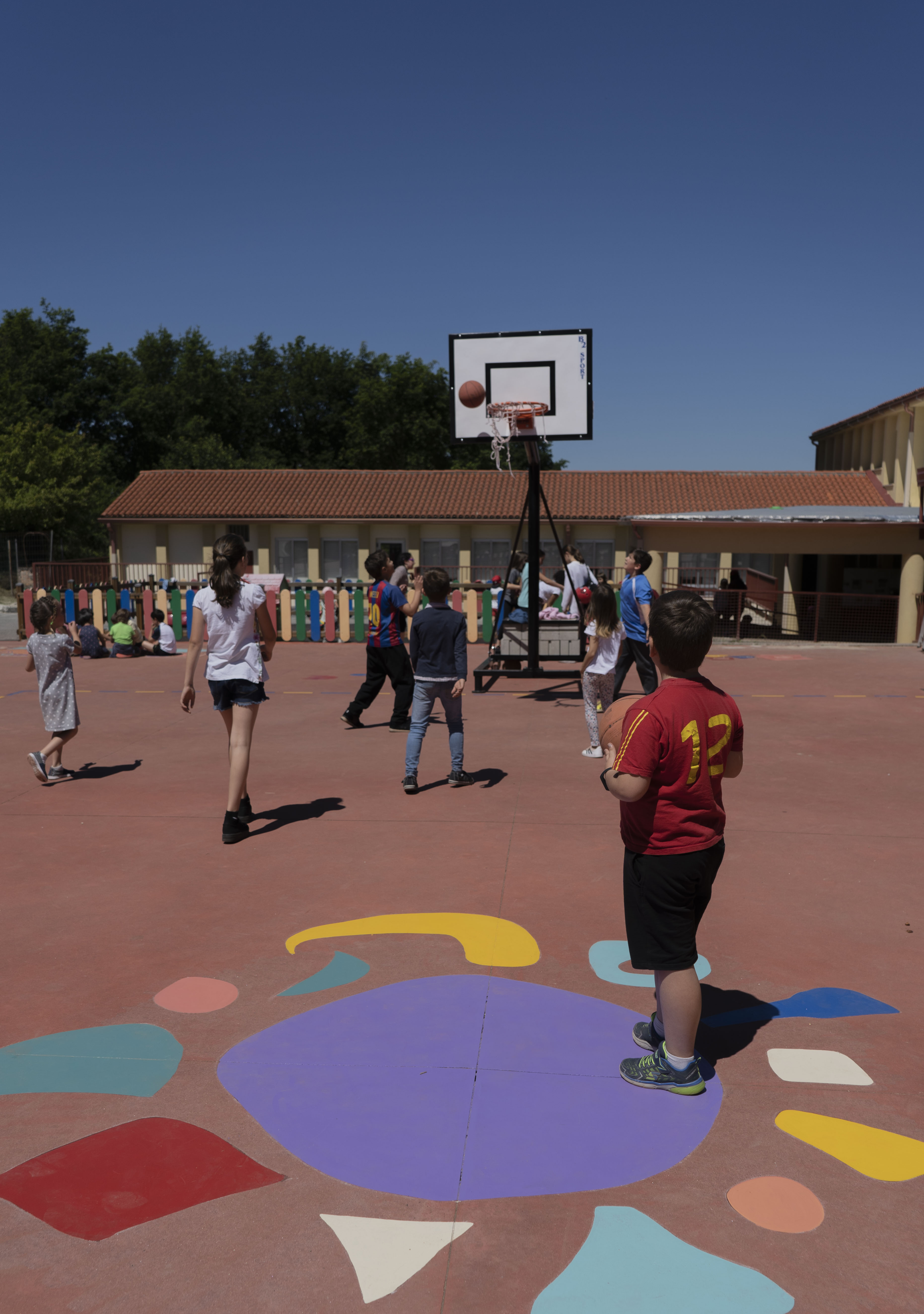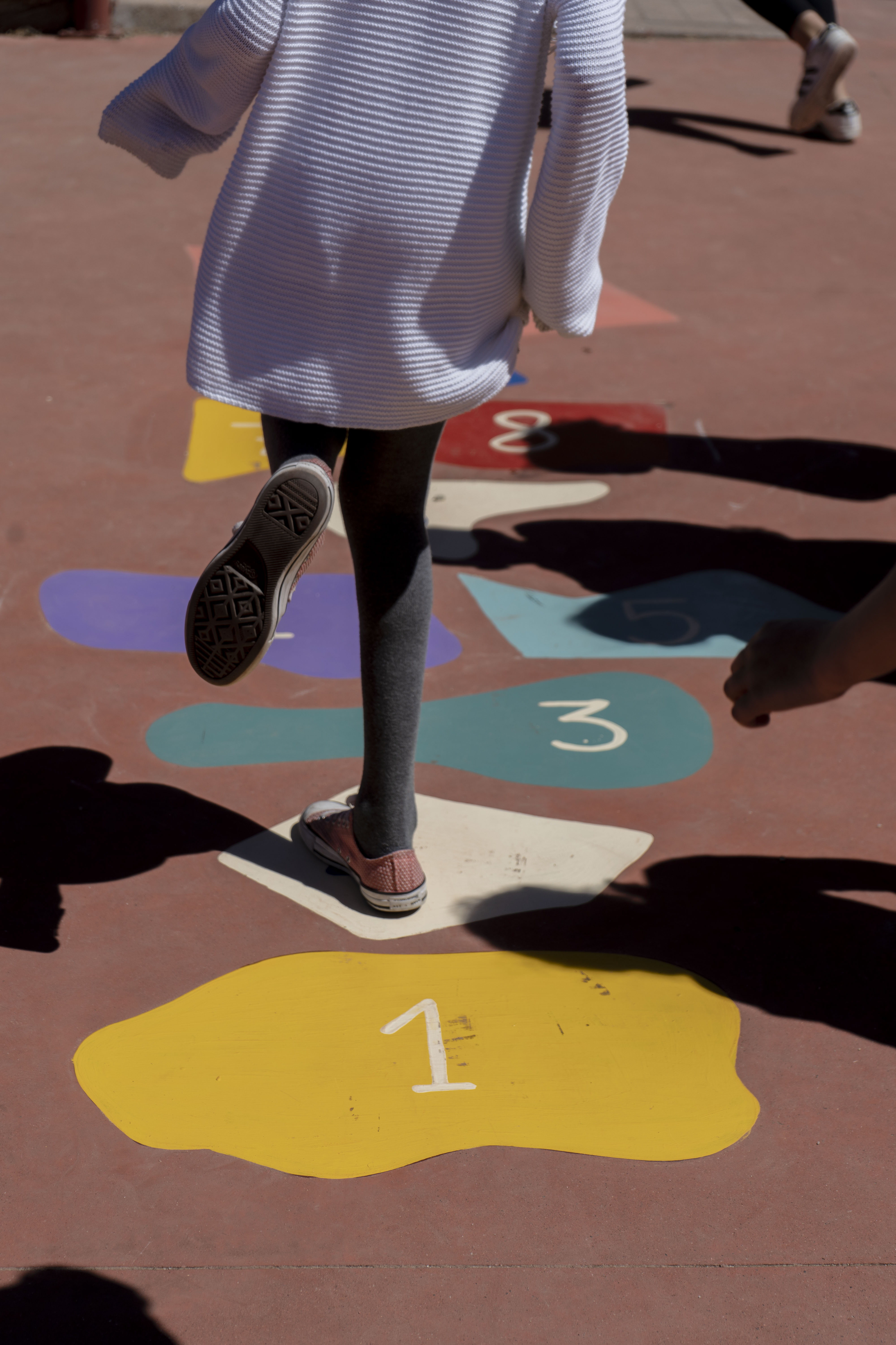 rayuelas, tableros de ajedrez y 3 en raya, una miniciudad, un twister y un recorrido para educación física.